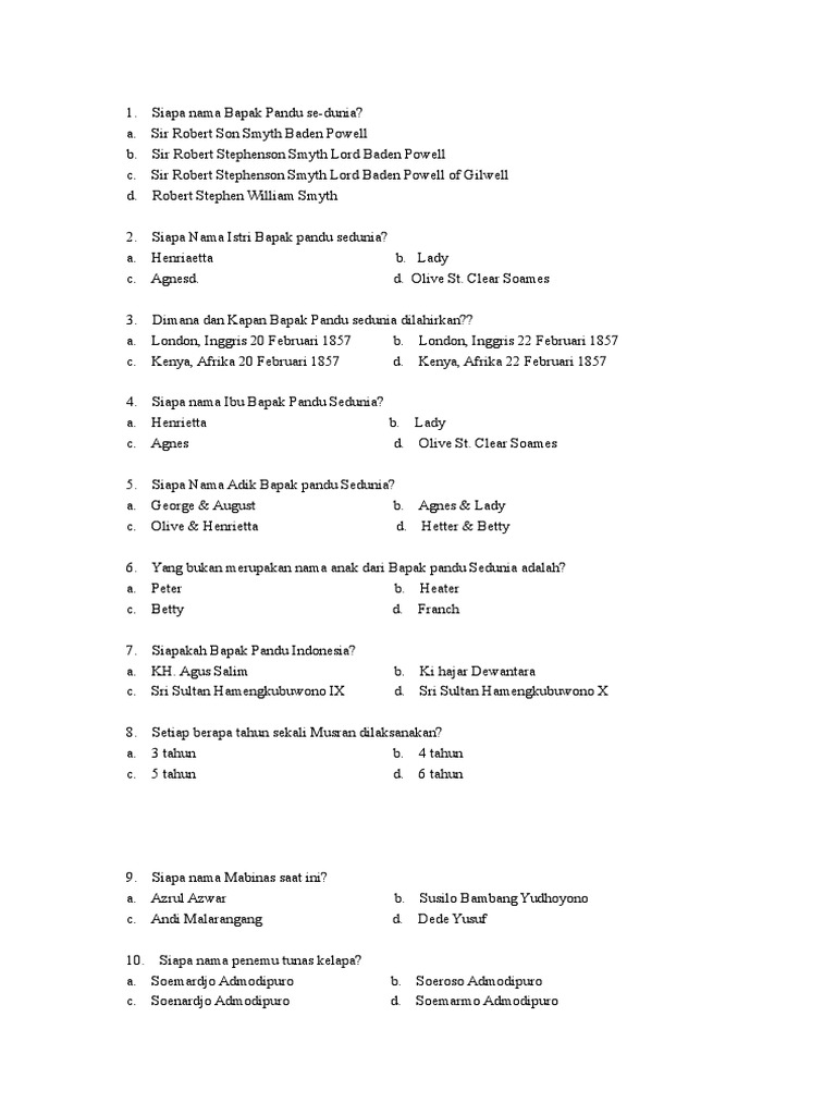 Kl yg palistin itu kan waktu itu belum jadi negara dan pengakuannya pas 1944 bahkan indonesia disitu belum mikir bakalan merdeka. 35 contoh soal pilihan ganda & jawaban untuk pramuka penggalang kelas sd dan smp terbaru 2021 100 soal pramuka terkini dilengkapi kunci jawabannya. 20200915 posting komentar untuk soal pramuka penggalang beserta jawabannya. Contoh latihan soal kepramukaan dan kunci jawabannya bagian 3 ini berbentuk pilihan ganda dan berjumlah 40 butir dengan dilengkapi kunci jawabannya. Bapak pramuka indonesia lahir pada tanggal berapa…. Soal (pilihan ganda) pramuka dan jawaban contoh soal pilgan tentang pramuka 1. Apa sebutan pramuka di malaysia ( persekutuan pengakap malaysia ) 3. Soal pilihan ganda pengetahuan pramuka 1.